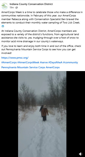 This week’s feature is the Indiana County Conservation District’s Facebook post on AmeriCorps. Follow the district at https://www.facebook.com/iccdpa/.