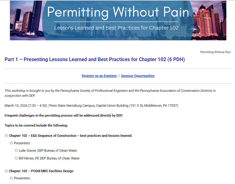 PACD and the PA Society of Professional Engineers, in conjunction with the PA Department of Environmental Protection, are hosting an Engineers Workshop: Permitting without Pain – Presenting Lessons Learned and Best Practices for Chapter 102. Six professional development hours are offered.